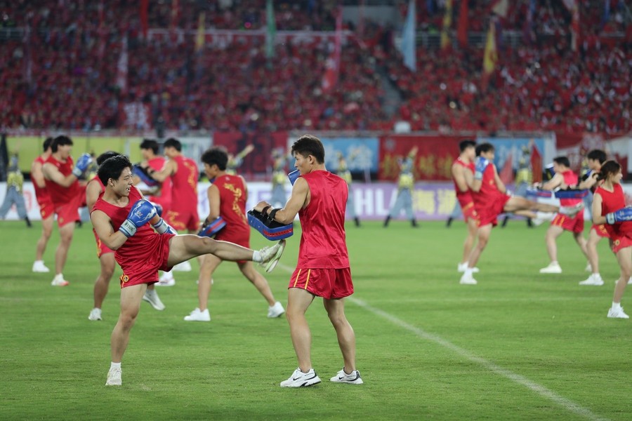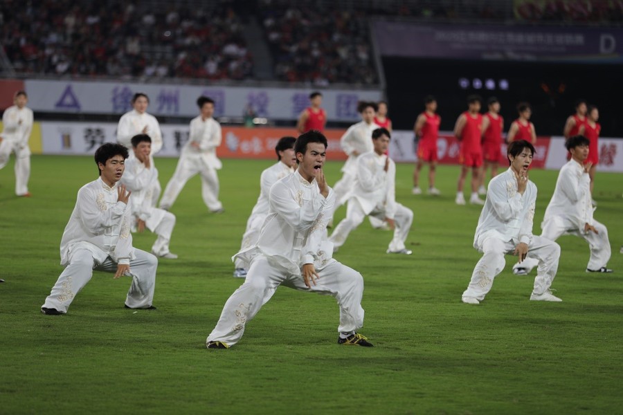 9月20日晚,“苏超”联赛第12轮徐州队与苏州队的比赛在徐州奥体中心拉开帷幕。开赛前夕,169名江苏师范大学学子以一场气势恢宏的《大汉雄风》表演,将现场氛围推向首个高潮。这场长达7分钟的表演,将中华武术与兵马俑舞元素深度融合,以“武魂起,俑魄生”为核心理念,通过刚猛凌厉的武技与雄浑厚重的舞姿,生动再现了古代战场的豪情。刀光随鼓点流转,阵型随韵律变幻,动静之间,令现场数万名观众沉浸于跨越时空的文化震撼,更彰显出徐州作为两汉文化发源地的深厚底蕴。