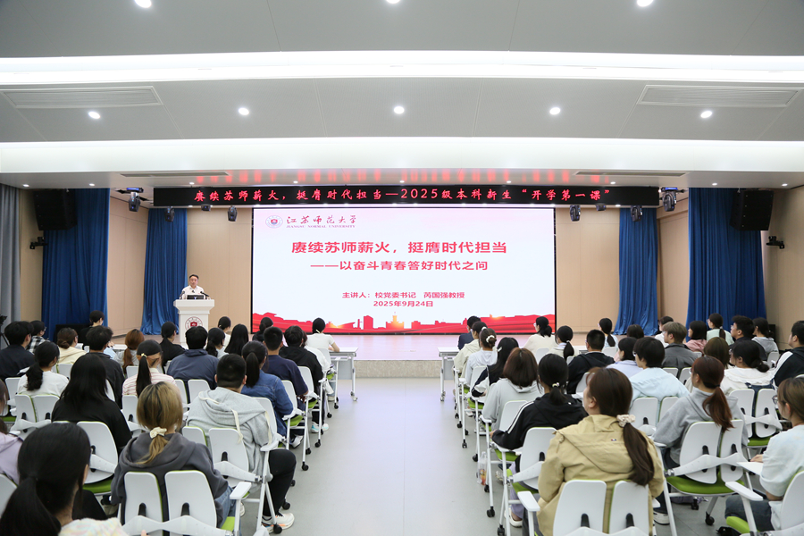 9月24日下午,校党委书记芮国强以《赓续苏师薪火,挺膺时代担当——以奋斗青春答好时代之问》为题,为2025级本科新生讲授“开学第一课”。