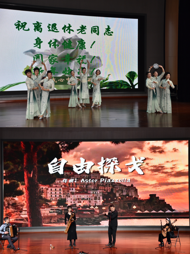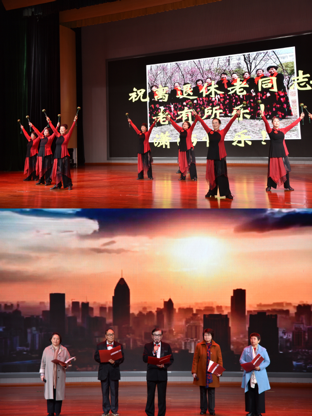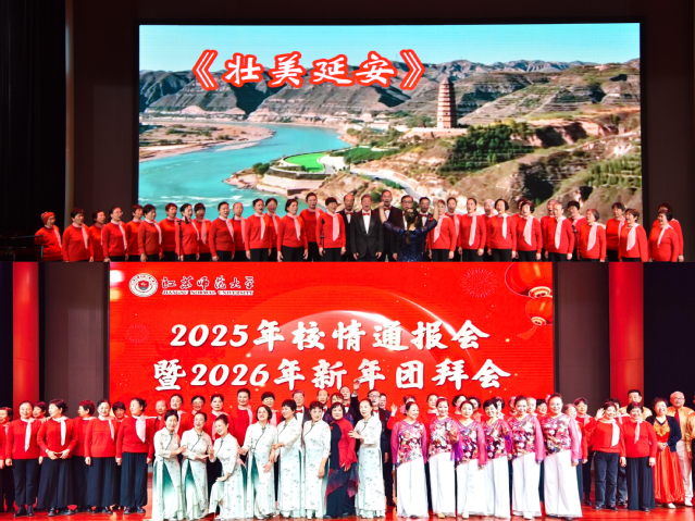 校情通报会后,团拜会文艺演出精彩上演。老同志们通过形式多样的节目展现出饱满的精神风采与艺术才情。牛山活动中心表演的养生艾草锤操《带你潇洒带你嗨》活泼开场,舞蹈《你是我心中的茉莉花》轻盈曼妙,别具一番清雅韵味。关工委青春咏诵团的老师们饱含深情朗诵《诗意中国》,抒发炽热的爱国情怀。老年体协的舞蹈《我把故乡比苏杭》舞姿翩跹,交谊舞《今天是你的生日》以祝福传递温馨。老年戏曲协会表演的京剧曲牌《海青歌》与清唱《洪羊洞》选段韵味醇厚,尽展国粹魅力。音乐学院教师专业助阵,独唱歌曲《爱永在》深情款款、打动人心,器乐重奏《自由探戈》以热情奔放的旋律点燃全场气氛。最后,全体离退休教职工齐声高唱《壮美延安》与《歌声与微笑》,铿锵而温暖的歌声回荡在整个会场,团拜会圆满落幕。
