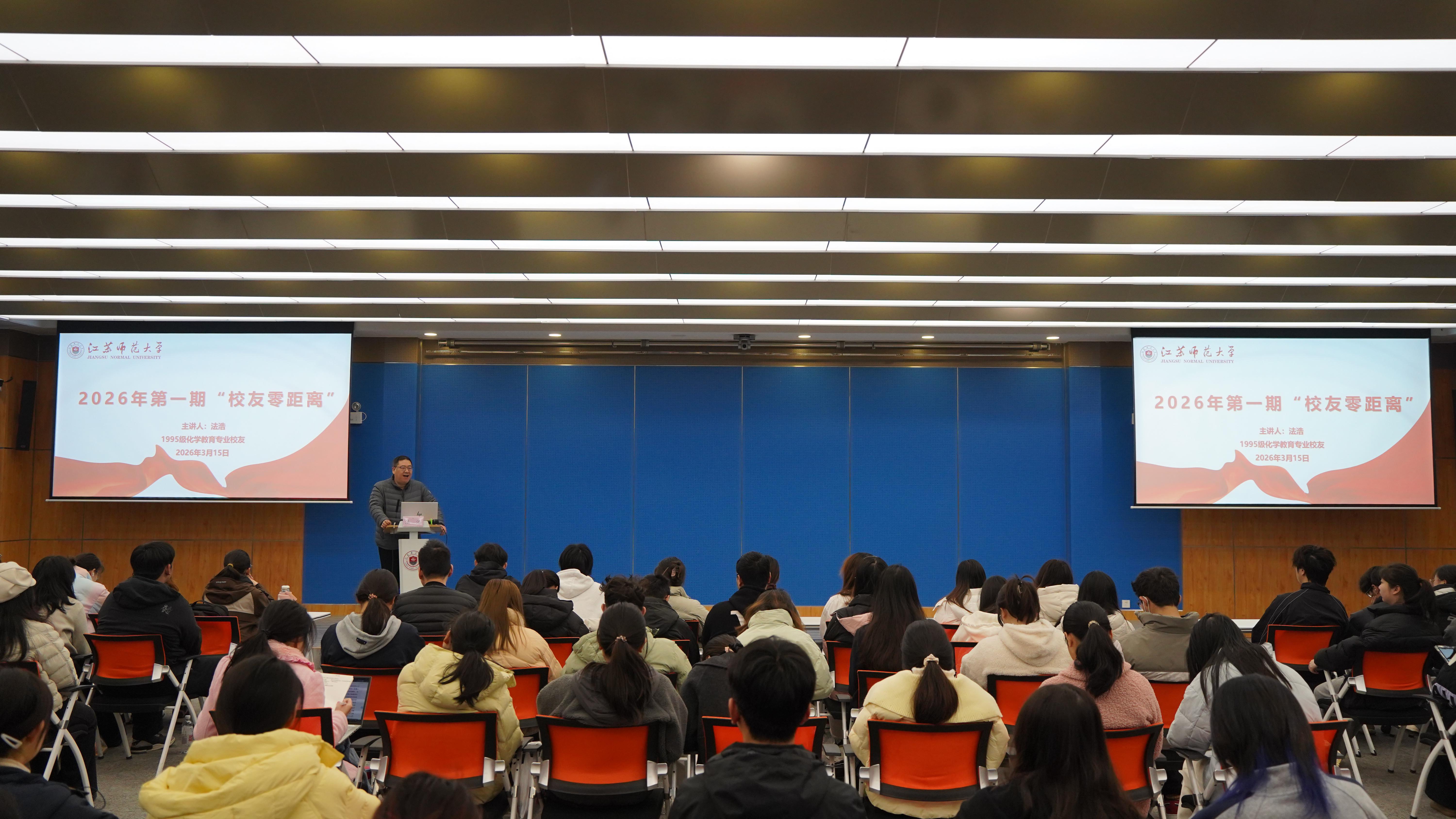 3月15日上午,2026年第一期“校友零距离”在分析测试中心300会议室举行。我校1995级化学教育专业校友、江苏省教学名师、徐州高级中学教师发展处处长法浩以“守正中创新:新时代职业素养的定位与提升”为题,分享他对职业发展的思考与实践,与在校学子展开深度交流。