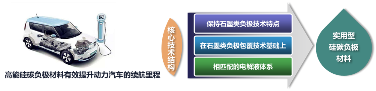 (1)高能硅碳电池负极材料研发。围绕我国新能源汽车电池负极材料重大需求,开发的高能硅碳负极材料具有传统石墨负极材料的优势,首效高,压实密度高,成本低,可兼容目前商业化的电池制作设备,在传统石墨负极材料生产工艺上进行改进,产品工艺稳定性好,可以有效提升动力汽车的续航里程。