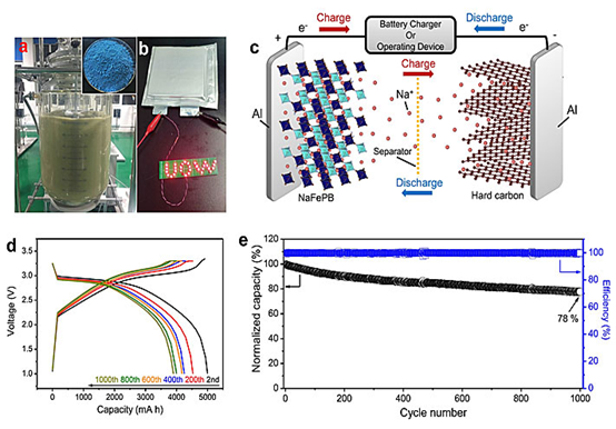 (3)高比能量负极硬碳材料研发。利用特殊生物质碳转化技术将秸秆有效转化成可供钠离子电池使用的高比能量负极硬碳材料,并开发出普鲁士蓝/硬碳电池体系钠离子电池,电化学性能稳定,电极材料价格低廉、绿色环保,电池安全性极高,可应用于大规模智能电网储能。
