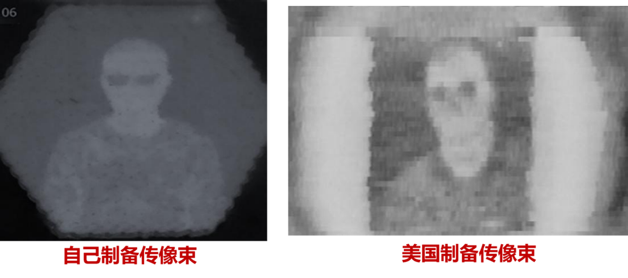 (2)红外光纤传像束研发。针对红外热像传输效率低、传输有效性和抗干扰性低等问题,研制出高分辨率红外光纤传像束,解决传统热像传输像质粗糙问题,分辨率达美国海军实验室的3倍以上,传像性能国际领先,研制了超大模场中红外光子晶体光纤,模场面积提升60倍,在图像传输、标的物图像捕获等军民领域具有重要的应用需求。