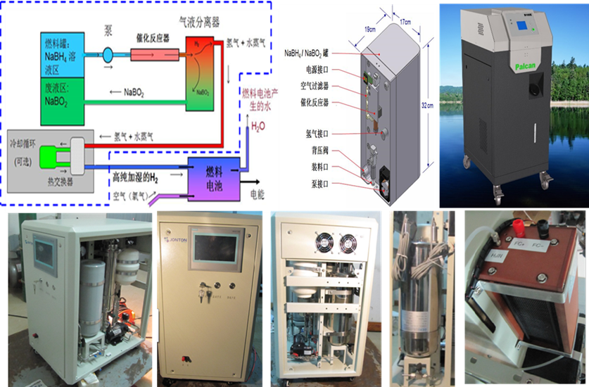 (4)新型燃料电池系统研发。基于化学制氢专利技术研发的新型供氢一体化燃料电池系统,具有无噪音、无有害排放、工作温度低、红外隐蔽性能好、贮能发电效率高等优点,非常适合现场制氢和发电。