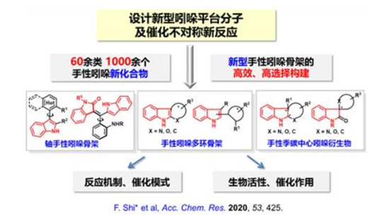 (2)手型杂环药物活性分子研发。手性杂环是手性药物和功能材料的核心结构单元,手性杂环的精准构筑是研发手性新药和手性新材料的关键科学问题。围绕这一科学问题,设计了手性杂环的精准构筑策略,实现了具有重要意义的手性五元至七元杂环、轴手性杂环、螺环手性杂环的高效、高选择性构筑,并且发现了具有重要药理活性的手性杂环分子,为新型手性杂环药物的研发提供了高效的合成方法学和丰富的手性化合物库。