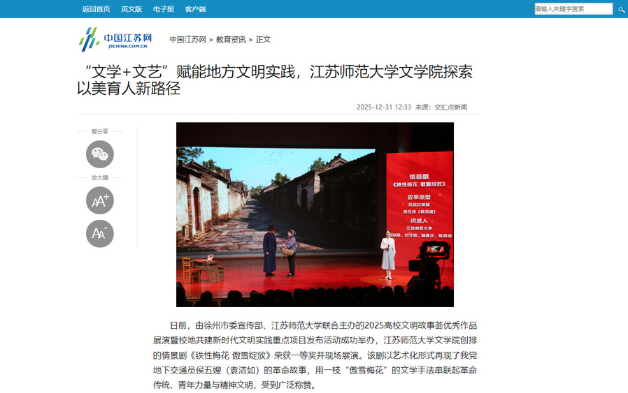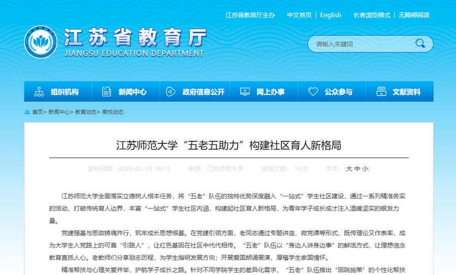 江苏省教育厅官网1月19日关注我校“五老五助力”构建社区育人新格局工作经验,内容如下:江苏师范大学“五老五助力”构建社区育人新格局江苏师范大学全面落实立德树人根本任务,将“五老”队伍的独特优势深度融入“一站式”学生社区建设,通过一系列精准务实的活动,打破传统育人边界,丰富“一站式”学生社区内涵,构建起社区育人新格局,为青年学子成长成才注入温暖坚实的银发力量。党建强基与思政铸魂并行,筑牢成长思想根基。在党建引领方面,老同志通过专题讲座、微党课等形式,既传理论又作表率,成为大学生入党路上的可靠“引路