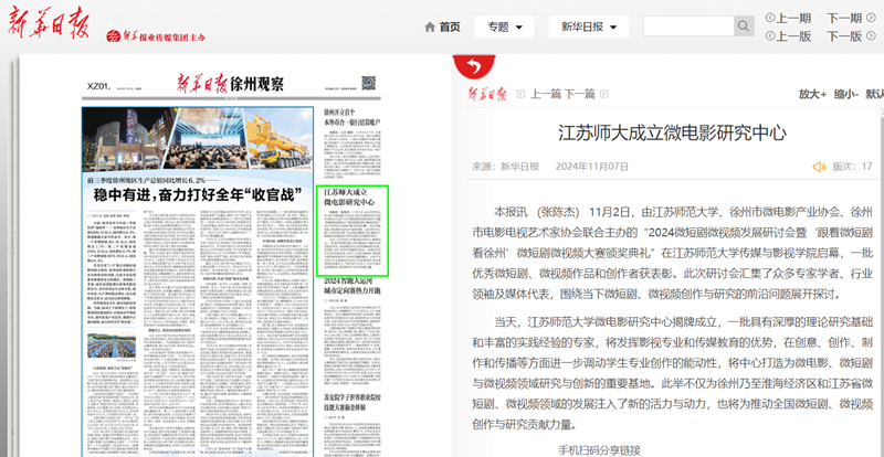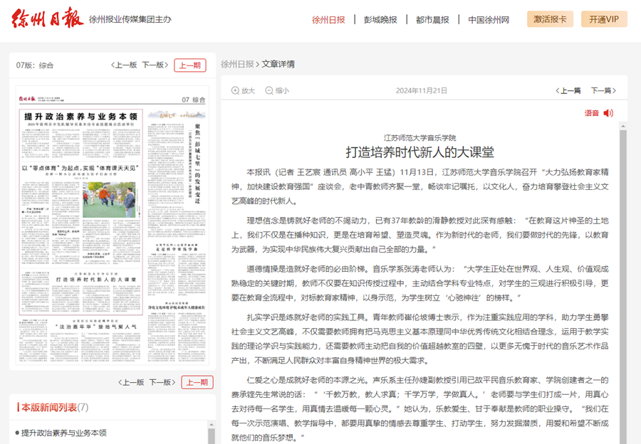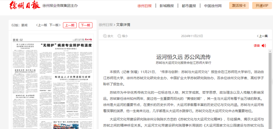 徐州日报11月26日第八版,整版报道在我校举办的苏轼文化与大运河文化研讨会,报道内容如下:大运河上苏公来——我市学者聚焦苏轼文化与大运河文化的融合创新 北宋文豪苏轼与千年流淌的大运河有着深厚的渊源。他一生南来北往,来去徐州皆从大运河水路穿行。苏轼文化与大运河文化都是中华优秀传统文化的重要组成部分。 11月21日由江苏师范大学、徐州市苏轼文化研究会主办的“传承与创新:苏轼与大运河文化”报告会,围绕苏轼文化与大运河文化这一主题,展开多维度、深层次地探讨与交流。 报告会的演讲者中,有对此课题
