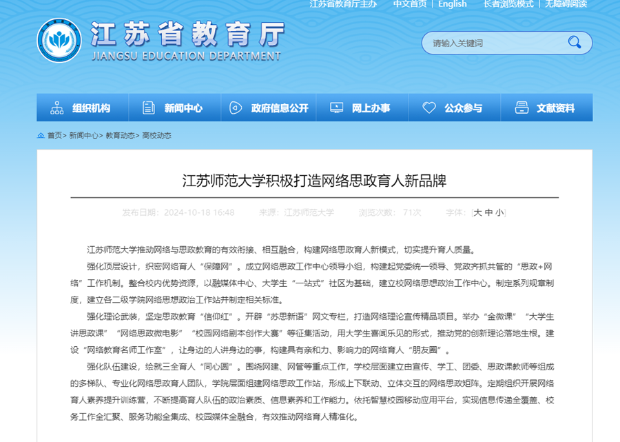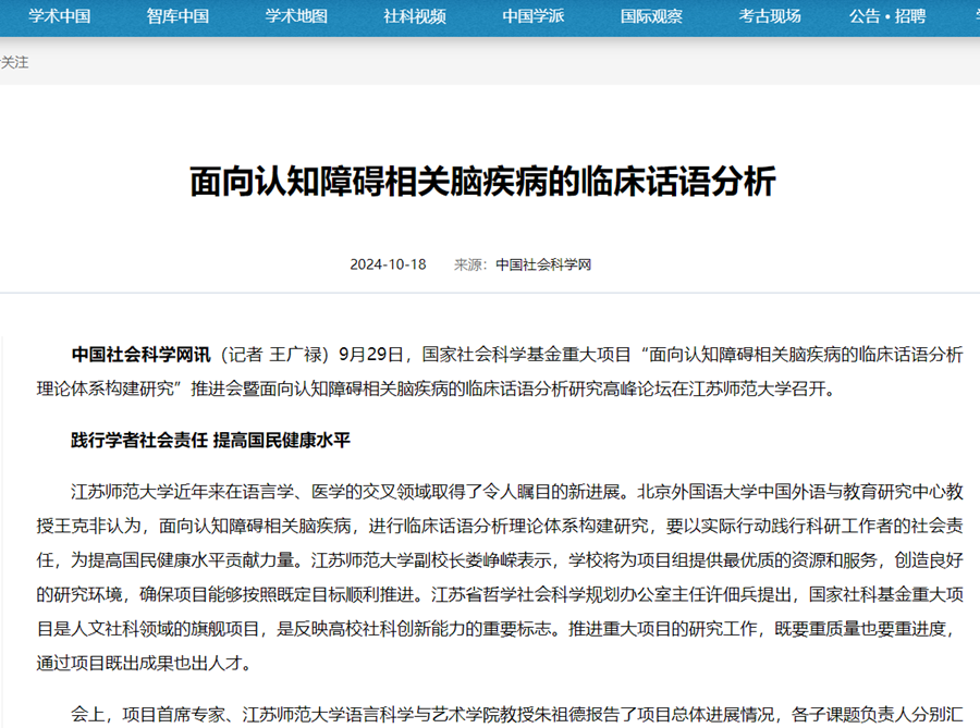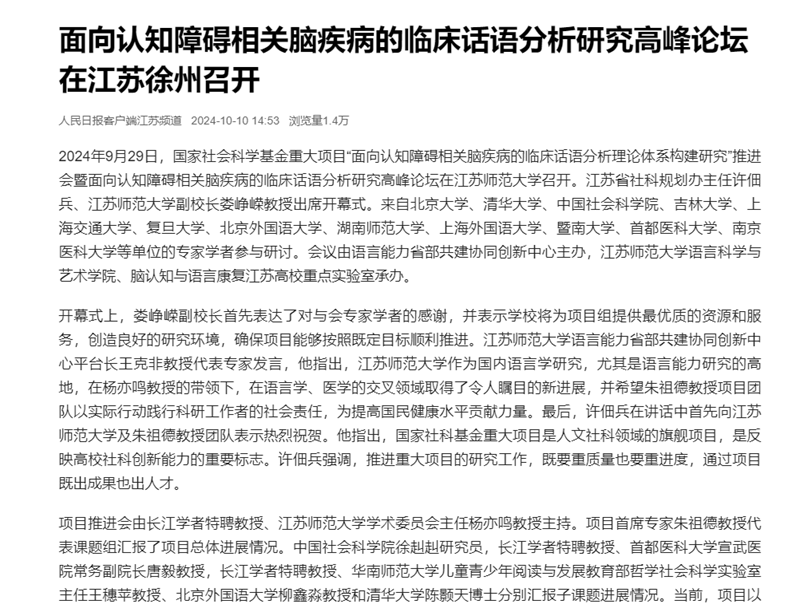 人民日报客户端10月10日报道我校举办的面向认知障碍相关脑疾病的临床话语分析研究高峰论坛,报道内容如下:面向认知障碍相关脑疾病的临床话语分析研究高峰论坛在江苏徐州召开 2024年9月29日,国家社会科学基金重大项目“面向认知障碍相关脑疾病的临床话语分析理论体系构建研究”推进会暨面向认知障碍相关脑疾病的临床话语分析研究高峰论坛在江苏师范大学召开。江苏省社科规划办主任许佃兵、江苏师范大学副校长娄峥嵘教授出席开幕式。来自北京大学、清华大学、中国社会科学院、吉林大学、上海交通大学、复旦大学、北京外