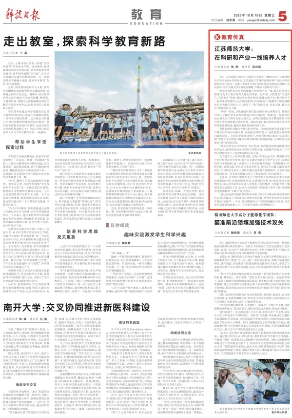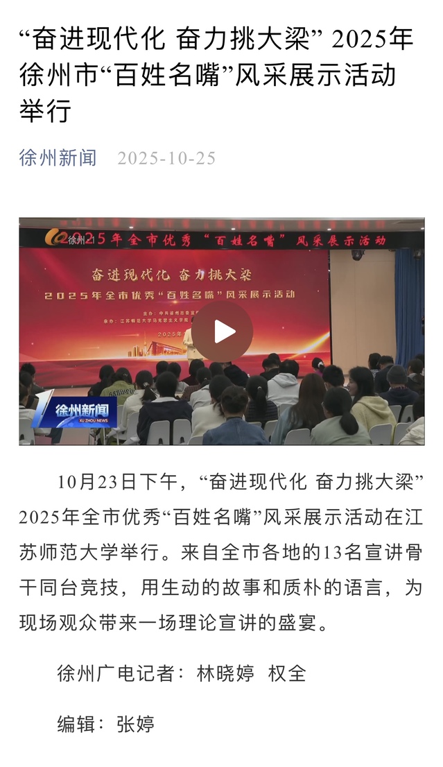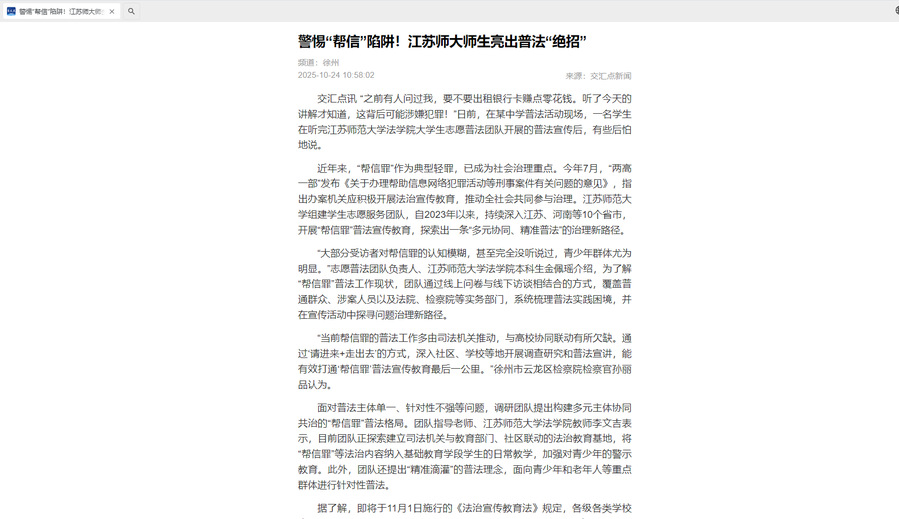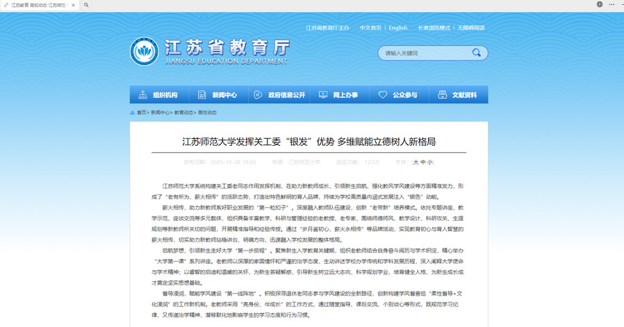 江苏省教育厅官方网站10月28日关注我校发挥关工委“银发”优势,多维赋能立德树人新格局工作经验,内容如下:江苏师范大学发挥关工委“银发”优势,多维赋能立德树人新格局江苏师范大学系统构建关工委老同志作用发挥机制,在助力新教师成长、引领新生启航、强化教风学风建设等方面精准发力,形成了“老有所为、薪火相传”的活跃态势,打造出特色鲜明的育人品牌,持续为学校高质量内涵式发展注入“银色”动能。薪火相传,助力新教师系好职业发展的“第一粒扣子”。深度融入教师队伍建设,创新“老带新”培养模式。依托专题讲座、教学示
