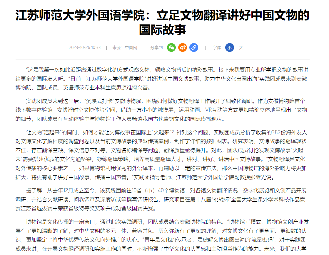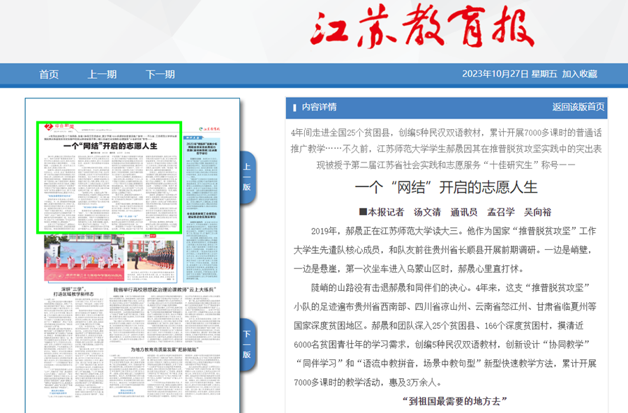 江苏教育报10月27日报道我校学生郝晟同学的推普脱贫攻坚和支教实践事迹,报道内容如下: 4年间走进全国25个贫困县,创编5种民汉双语教材,累计开展7000多课时的普通话推广教学……不久前,江苏师范大学学生郝晟因其在推普脱贫攻坚实践中的突出表现被授予第二届江苏省社会实践和志愿服务“十佳研究生”称号一个“网结”开启的志愿人生 ■本报记者 汤文清 通讯员 孟召学 吴向裕 2019年,郝晟正在江苏师范大学读大三。他作为国家“推普脱贫攻坚”工作大学生先遣队核心成员,和队友前往贵州省长顺县开展前期调