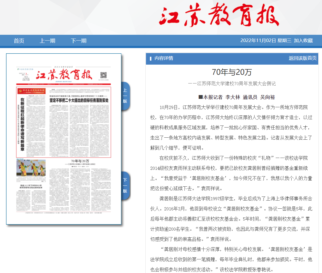 11月2日,江苏教育报头版报道我校建校70周年,报道内容如下:70年与20万——江苏师范大学建校70周年发展大会侧记■本报记者李大林通讯员吴向裕 10月29日,江苏师范大学举行建校70周年发展大会。作为一所地方师范院校,在70年的办学历程中,江苏师大始终以深厚的人文情怀倾力育才造士,以过硬的科教成果服务区域发展,培养了一批批心怀家国、有责任担当的优秀人才,走出了一条地方高校内涵发展、转型发展、特色发展之路。记者从发展大会上了解到几个细节,便可证明。 在校庆前不久,江苏师大收到了一份特殊的