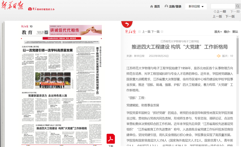新华日报以《江苏师范大学物理与电子工程学院推进四大工程建设构筑“大党建”工作新格局》为题,报道我校物理与电子工程学院党建工作,报道内容如下:江苏师范大学物理与电子工程学院推进四大工程建设 构筑“大党建”工作新格局 江苏师范大学物理与电子工程学院始建于1958年,是苏北地区首个从事物理方向师范生培养、光学工程领域科研与专业人才培养的单位。近年来,学院将党建融入国家重大战略需求、江苏省重大决策部署、徐州市区域中心城市建设和学校学院事业发展,推进“领航、铸魂、强基、护航”四大工程建设,着力构筑“