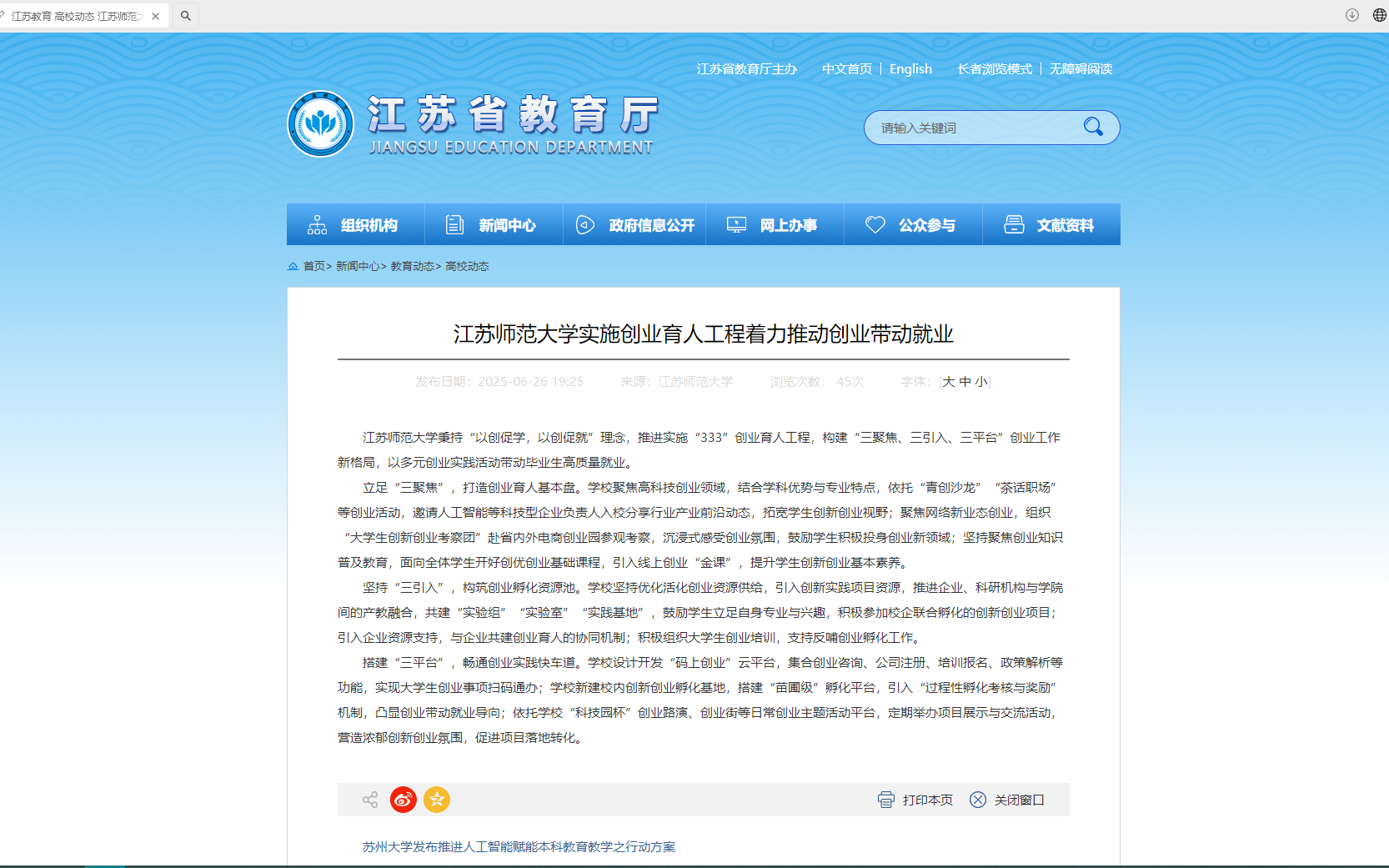 江苏省教育厅官网6月24日关注我校实施创业育人工程着力推动创业带动就业工作经验,内容如下:江苏师范大学实施创业育人工程着力推动创业带动就业江苏师范大学秉持“以创促学,以创促就”理念,推进实施“333”创业育人工程,构建“三聚焦、三引入、三平台”创业工作新格局,以多元创业实践活动带动毕业生高质量就业。立足“三聚焦”,打造创业育人基本盘。学校聚焦高科技创业领域,结合学科优势与专业特点,依托“青创沙龙”“茶话职场”等创业活动,邀请人工智能等科技型企业负责人入校分享行业产业前沿动态,拓宽学生创新创业视野