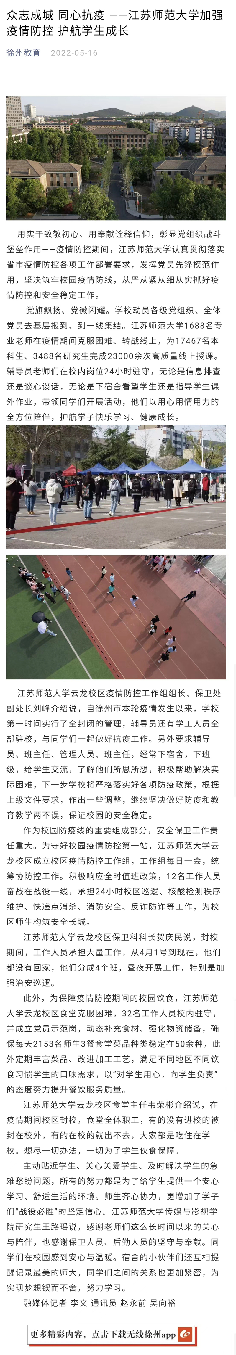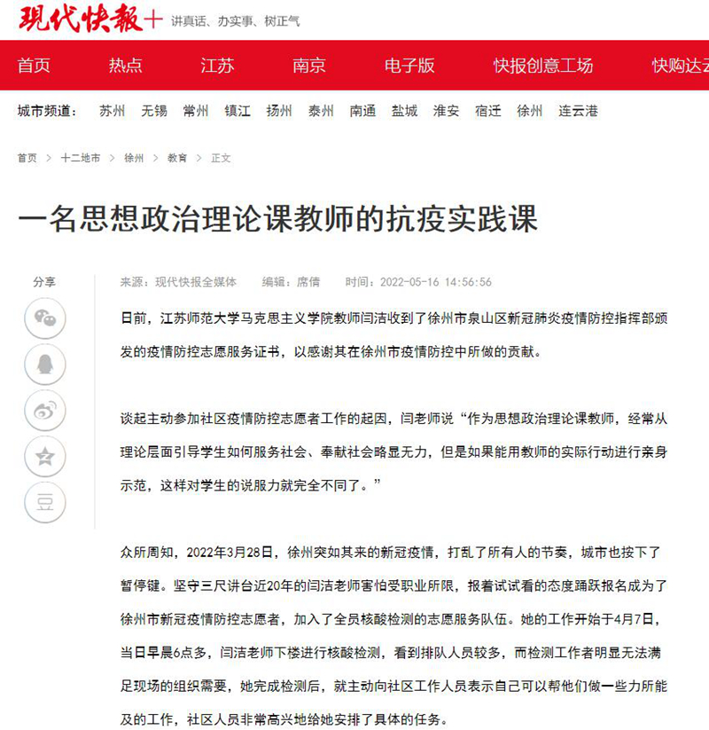 现代快报全媒体中心5月16日报道我校马克思主义学院思政课教师闫洁战“疫”事迹,报道如下:一名思想政治理论课教师的抗疫实践课来源:现代快报全媒体编辑:席倩 日前,江苏师范大学马克思主义学院教师闫洁收到了徐州市泉山区新冠肺炎疫情防控指挥部颁发的疫情防控志愿服务证书,以感谢其在徐州市疫情防控中所做的贡献。 谈起主动参加社区疫情防控志愿者工作的起因,闫老师说“作为思想政治理论课教师,经常从理论层面引导学生如何服务社会、奉献社会略显无力,但是如果能用教师的实际行动进行亲身示范,这样对学生的说服力就