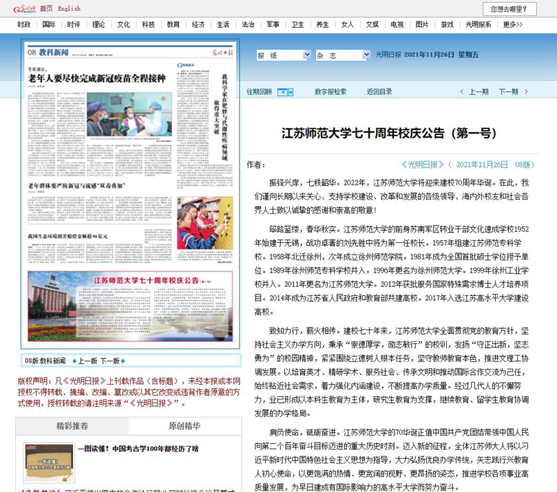 【新华社客户端】【光明日报】江苏师范大学七十周年校庆公告(第一号)