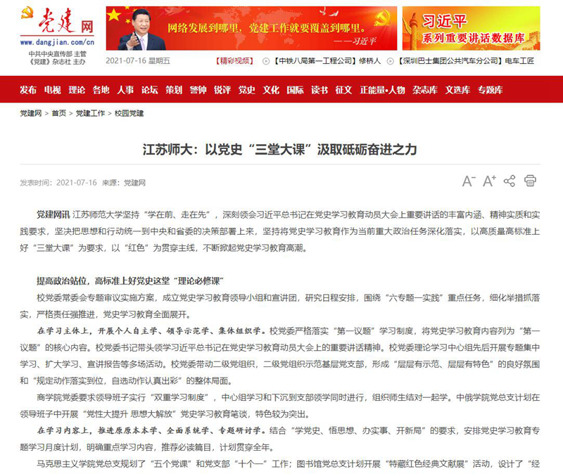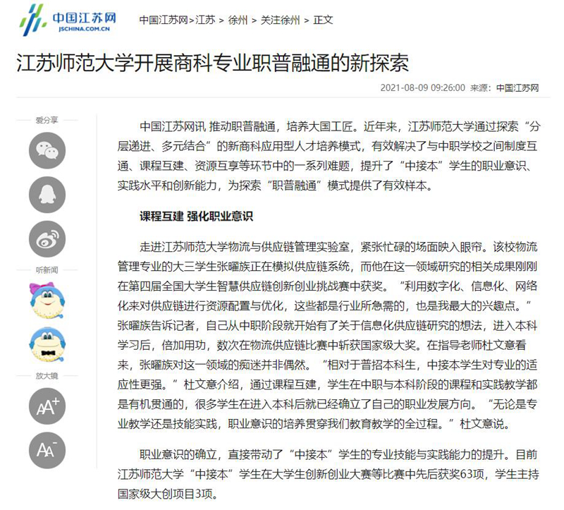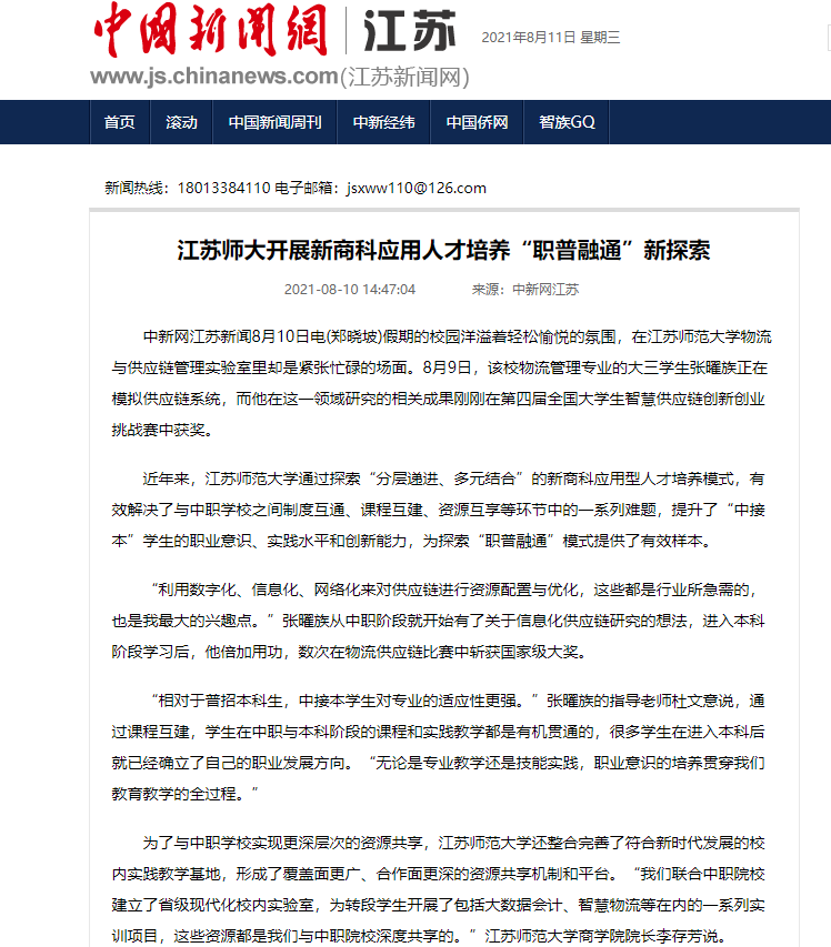 中国新闻网8月10日报道我校商科应用人才培养创新举措,报道内容如下:江苏师大开展新商科应用人才培养“职普融通”新探索 中新网江苏新闻8月10日电(郑晓坡)假期的校园洋溢着轻松愉悦的氛围,在江苏师范大学物流与供应链管理实验室里却是紧张忙碌的场面。8月9日,该校物流管理专业的大三学生张曜族正在模拟供应链系统,而他在这一领域研究的相关成果刚刚在第四届全国大学生智慧供应链创新创业挑战赛中获奖。 近年来,江苏师范大学通过探索“分层递进、多元结合”的新商科应用型人才培养模式,有效解决了与中职学校之间