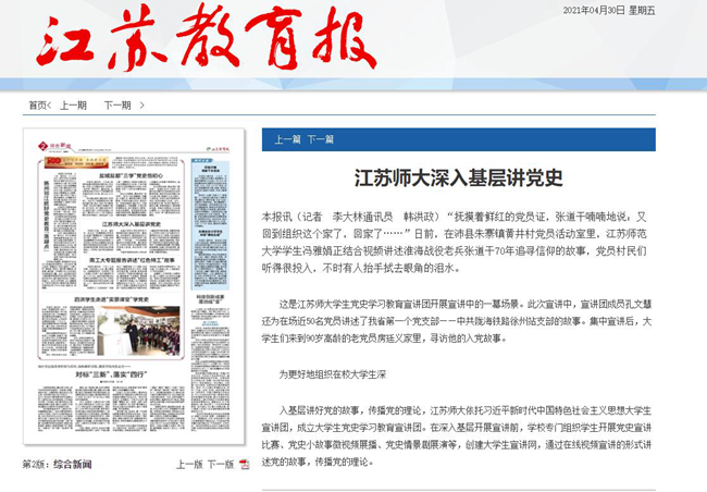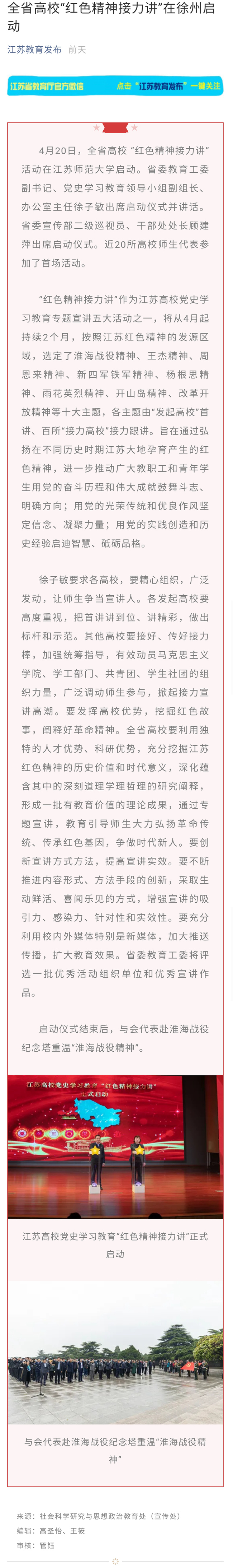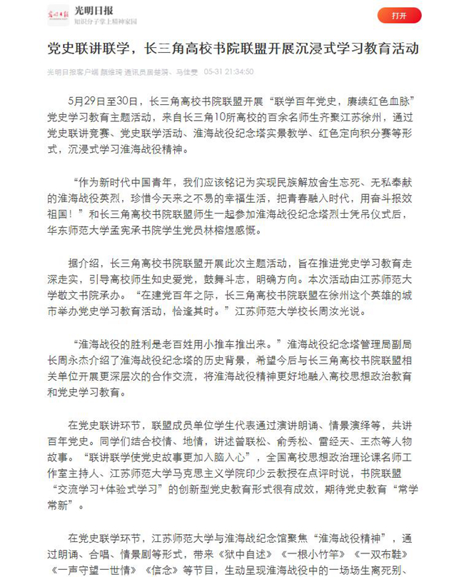 光明日报客户端5月31日报道在我校举办的长三角高校书院联盟党史学习教育沉浸式学习,报道内容如下:党史联讲联学,长三角高校书院联盟开展沉浸式学习教育活动 5月29日至30日,长三角高校书院联盟开展“联学百年党史,赓续红色血脉”党史学习教育主题活动,来自长三角10所高校的百余名师生齐聚江苏徐州,通过党史联讲竞赛、党史联学活动、淮海战役纪念塔实景教学、红色定向积分赛等形式,沉浸式学习淮海战役精神。 “作为新时代中国青年,我们应该铭记为实现民族解放舍生忘死、无私奉献的淮海战役英烈,珍惜今天来之不易的