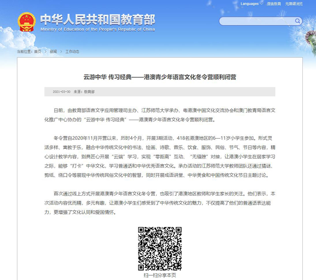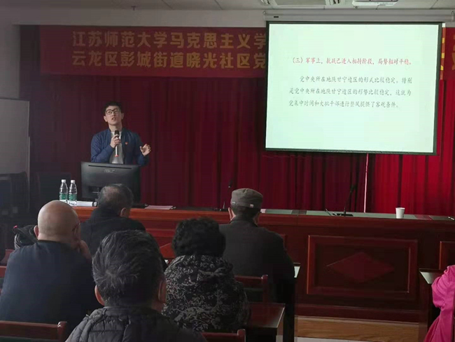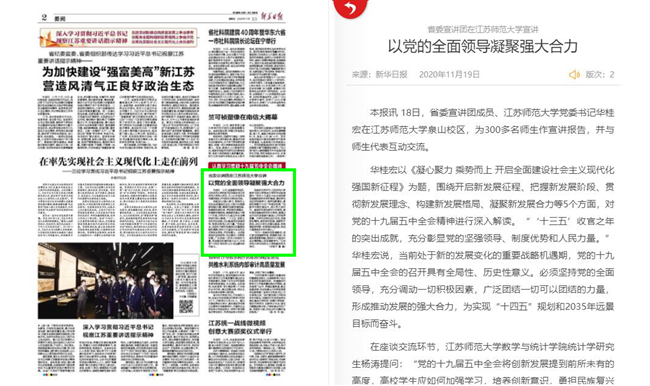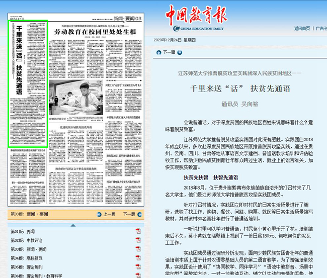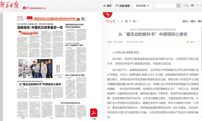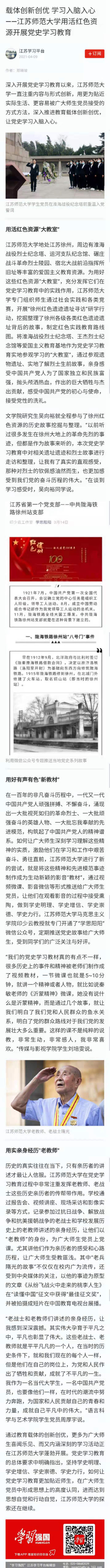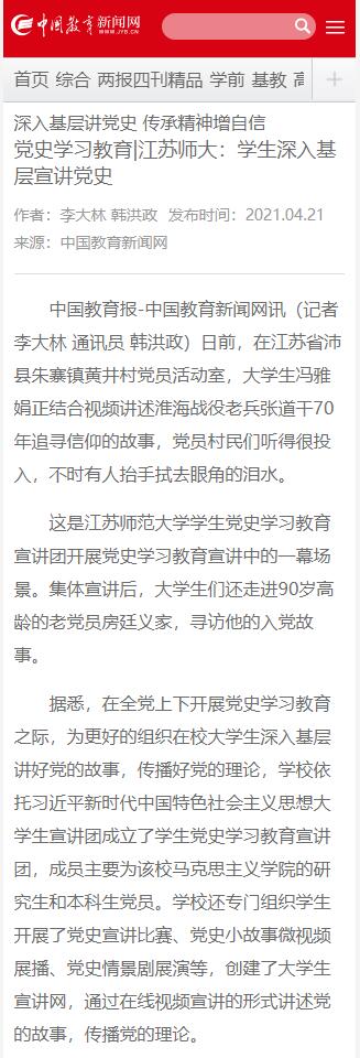 4月21日中国教育网报道我校大学生宣讲团,报道内容如下:深入基层讲党史传承精神增自信党史学习教育|江苏师大:学生深入基层宣讲党史 中国教育报-中国教育新闻网讯(记者李大林通讯员韩洪政)日前,在江苏省沛县朱寨镇黄井村党员活动室,大学生冯雅娟正结合视频讲述淮海战役老兵张道干70年追寻信仰的故事,党员村民们听得很投入,不时有人抬手拭去眼角的泪水。 这是江苏师范大学学生党史学习教育宣讲团开展党史学习教育宣讲中的一幕场景。集体宣讲后,大学生们还走进90岁高龄的老党员房廷义家,寻访他的入党故事。