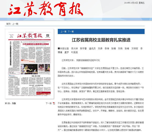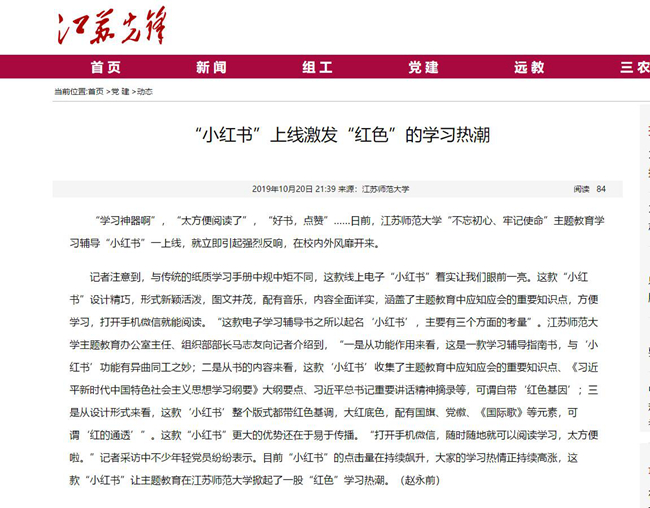 中国江苏网以“江苏师范大学:创新手段传习、传播、传承‘淮海战役精神’”为题,报道我校红色校园文化建设。报道内容如下:江苏师范大学:创新手段传习、传播、传承“淮海战役精神” 中国江苏网11月4日徐州讯(记者张扬通讯员张传琳)近日,一场别开生面的党课在江苏师范大学马可音乐厅举行,这是江苏师大与淮海战役烈士纪念塔管理局联合举办的一次创新性活动。这次党课以“初心永红”为主题,通过舞蹈、视频、情景剧、现场讲述等形式,生动展现了淮海战役中革命先烈如何用生命和鲜血践行初心使命的感人至深故事。鲜活的人物故