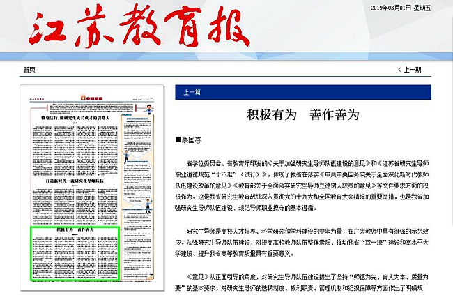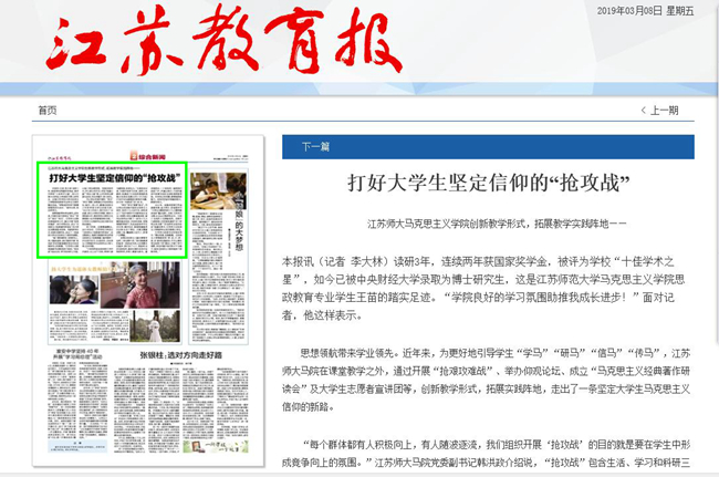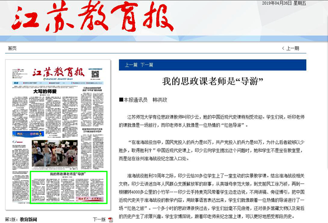 江苏教育报4月26日头版报道我校印少云教授思想政治理论课教学改革经验与新探索,报道内容如下:我的思政课老师是“导游”■本报通讯员 韩洪政 江苏师范大学有位思政课教师叫印少云,她的中国近现代史课特别受欢迎。学生们说,听印老师的课就像是一场旅行,而印老师本人就像是一位热情的“红色导游”。 “在淮海战役当中,国民党投入的兵力是80万,共产党投入的兵力是60万,为什么后者能够以少胜多,取得胜利?”中国近现代史课上,印少云向学生提出这个问题时,她和学生不是坐在教室里,而是站在徐州淮海战役纪念馆入口
