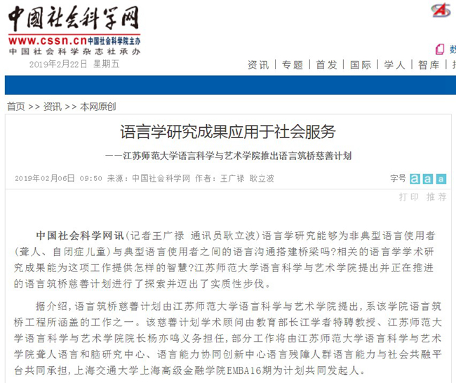 中国社会科学网2019年2月6日报道了我校语言科学与艺术学院学术研究成果转化服务社会的“语言筑桥慈善计划”,报道全文如下:语言学研究成果应用于社会服务——江苏师范大学语言科学与艺术学院推出语言筑桥慈善计划 中国社会科学网讯(记者王广禄通讯员耿立波)语言学研究能够为非典型语言使用者(聋人、自闭症儿童)与典型语言使用者之间的语言沟通搭建桥梁吗?相关的语言学学术研究成果能为这项工作提供怎样的智慧?江苏师范大学语言科学与艺术学院提出并正在推进的语言筑桥慈善计划进行了探索并迈出了实质性步伐。 据介