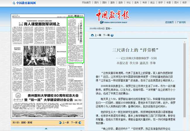 【中国教育报】三尺讲台上的“洋劳模”——记江苏师大外籍教师保罗·贝利