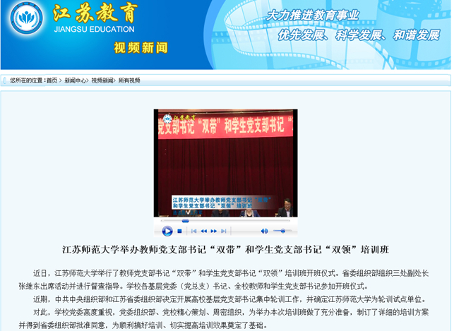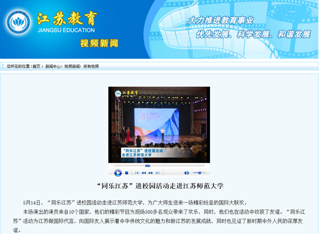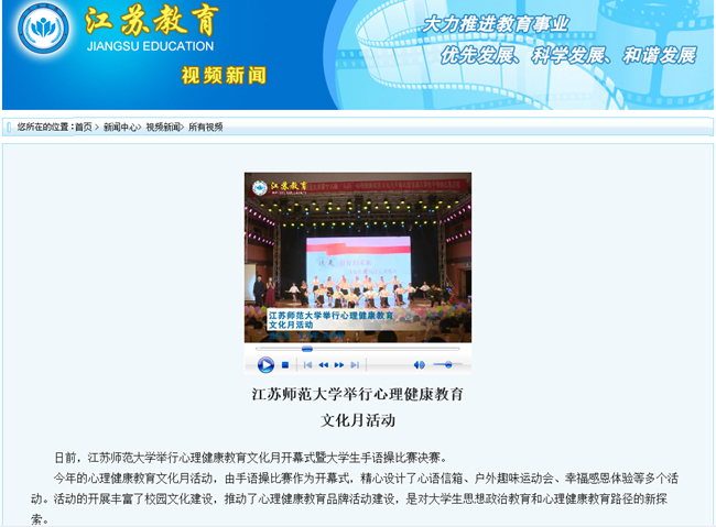 江苏教育网视频新闻5月28日报道我校举办的心理健康教育文化月活动。报道内容如下:江苏师范大学举行心理健康教育文化月活动 日前,江苏师范大学举行心理健康教育文化月开幕式暨大学生手语操比赛决赛。 今年的心理健康教育文化月活动,由手语操比赛作为开幕式,精心设计了心语信箱、户外趣味运动会、幸福感恩体验等多个活动。活动的开展丰富了校园文化建设,推动了心理健康教育品牌活动建设,是对大学生思想政治教育和心理健康教育路径的新探索。 在手语操比赛决赛中,学生们将作品以深沉细腻的曲调与触动心灵的歌词相融合