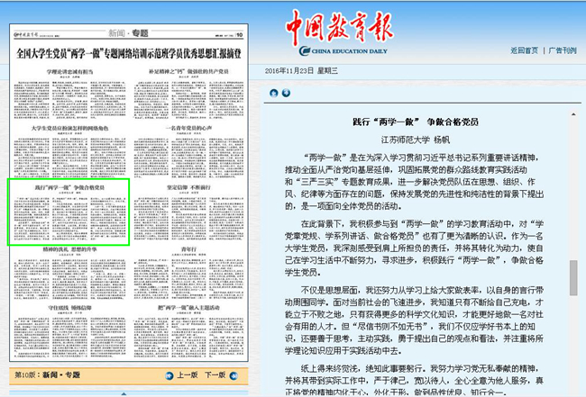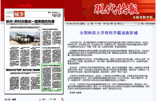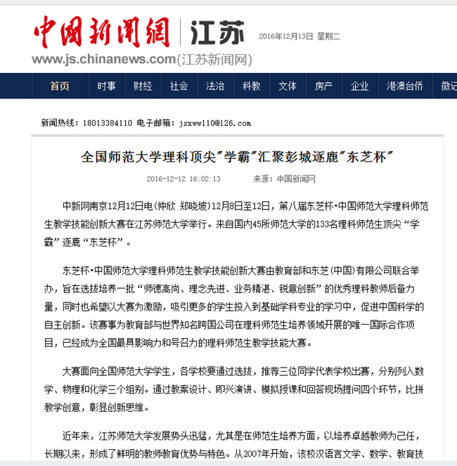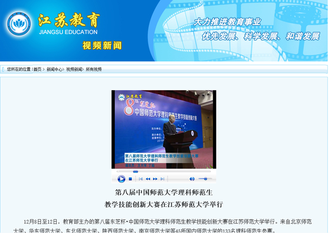 江苏教育网视频新闻报道我校举办的第八届中国师范大学理科师范生教学技能创新大赛。 报道全文如下:第八届中国师范大学理科师范生教学技能创新大赛在江苏师范大学举行 12月8日至12日,教育部主办的第八届东芝杯•中国师范大学理科师范生教学技能创新大赛在江苏师范大学举行。来自北京师范大学、华东师范大学、东北师范大学、陕西师范大学、南京师范大学等45所国内师范大学的133名理科师范生参赛。 教育部教师工作司司长王定华对大赛的成功举办和参赛选手们的优异表现表示祝贺,希望大赛能促进师范大学教师人才培养创