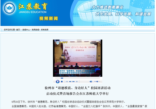 江苏教育网视频新闻10月8日报道在我校举行的徐州市“道德模范、身边好人”校园巡讲活动启动仪式暨首场报告会。 报道全文如下:徐州市“道德模范、身边好人”校园巡讲活动启动仪式暨首场报告会在江苏师范大学举行 9月28日下午,徐州市“道德模范、身边好人”校园巡讲活动启动仪式暨首场报告会在江苏师范大学举行。 全国道德模范、中国好人杜长胜,江苏省道德模范、中国好人、“全国三八红旗手”张玲兴,中国好人、“全国最美家庭”获得者张景宏,中国好人、“全国最美家庭”“全国孝老之星”“中华孝亲敬老之星”周长芝