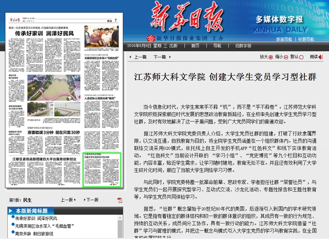 新华日报6月8日第7版以《江苏师大科文学院创建大学生党员学习型社群》为题,报道我校科文学院利用新媒体开展学生党员学习型社群建设。 报道全文如下:江苏师大科文学院创建大学生党员学习型社群 当今信息化时代,大学生常常手不释“机”,而不是“手不释卷”。江苏师范大学科文学院积极探索顺应时代发展的思想政治教育新路径,在全校率先创建大学生党员学习型社群,及时有效地解决了这一矛盾问题,受到广大党员同学们的普遍欢迎。 据江苏师大科文学院党委负责人介绍,大学生党员社群的组建,打破了行政隶属界限,以交流互