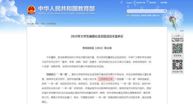 徐州日报11月16日第5版以《办学国际化打响文化牌——来自江苏师范大学的报告》为题专题报道我校国际化办学与对外交流。报道全文如下:办学国际化 打响文化牌——来自江苏师范大学的报告◎文/本报记者刘苏图/本报记者孙井贤 “今后,我们将与英国爱丁堡大学建立药食植物联合实验室,这是江苏师大首次与世界排名前50强高校的强强合作!”结束对西班牙、英国3所大学的8日考察后,江苏师范大学党委书记徐放鸣带来了振奋人心的消息。 当然,好消息不只这一个。在这次考察中,江苏师大还与西班牙阿尔卡拉大学签署校际交流框架