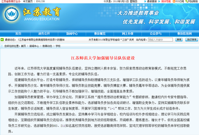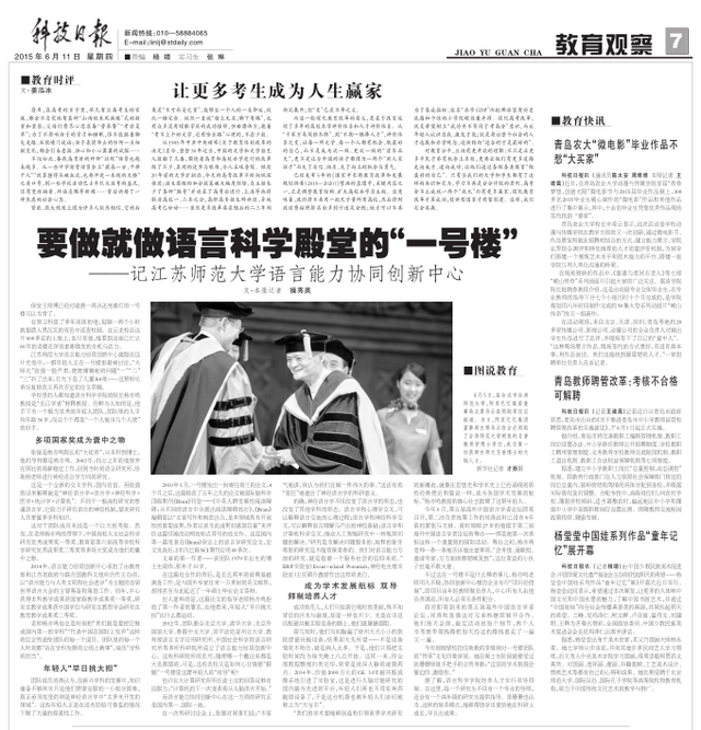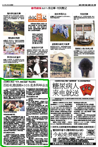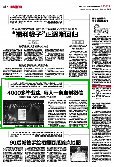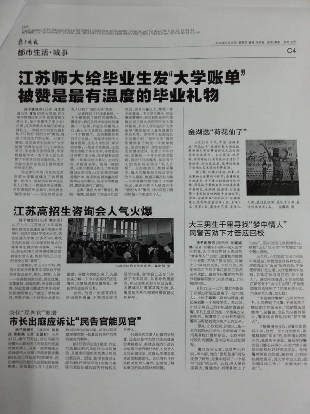 扬子晚报2015年6月25日C4版以《江苏师大给毕业生发送“大学账单”,被赞是最有温度的毕业礼物》为题,报道我校本科毕业典礼及毕业礼物。全文如下: 江苏师大给毕业生发“大学账单”被赞是最有温度的毕业礼物 扬子晚报讯(记者马志亚通讯员高洁)四年大学里,你在图书馆借过多少书,到食堂刷过多少卡,每个学期考了多少分?日前,江苏师范大学举行的毕业典礼上,一条校方为所有应届生私人订制的“我的大学”微信,触动了毕业生们的心弦。记者了解到,该则被学生戏称为“大学账单”的微信包含了几十种学生学