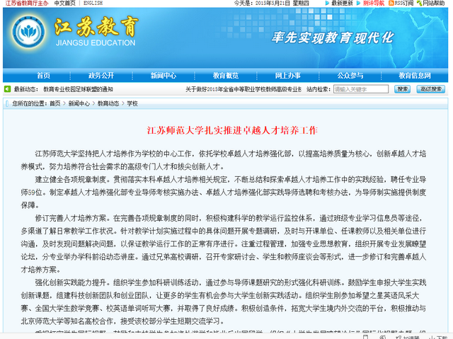江苏师范大学积极运用新媒体手段,努力增强官方微信的服务功能,提高微信的粘性;精心策划宣传内容,提高官方微信的吸引力,讲好中国故事、本校故事,起到了润物无声的宣传教育效果,被师生誉为“指尖上的德育”。 学校把微信作为数字化校园建设重要组成部分来抓,投入专项资金对官方微信服务号——“江苏师范大学”进行了二次开发。开发后的微信实现了其后台与学校统一身份认证系统及校园信息系统的对接,师生可以实时查阅校园新闻、通知公告、校内文件、招生信息和就业信息,可以查询学校课程安排、上课地点、考试成绩、图书馆书籍