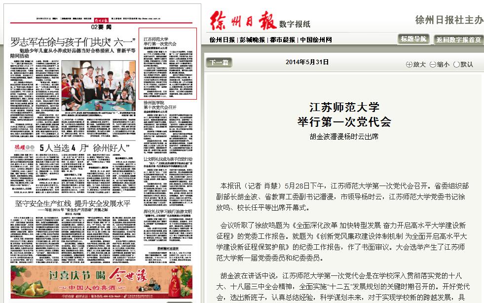 5月28日下午,江苏师范大学第一次党代会召开。省委组织部副部长胡金波、省教育工委副书记潘漫,市领导杨时云,江苏师范大学党委书记徐放鸣、校长任平等出席开幕式。会议听取了徐放鸣题为《全面深化改革加快转型发展奋力开启高水平大学建设新征程》的党委工作报告。就题为《创新党风廉政建设体制机制为全面开启高水平大学建设新征程保驾护航》的纪委工作报告,作了书面审议。大会选举产生了江苏师范大学新一届党委委员和纪委委员。胡金波在讲话中说,江苏师范大学第一次党代会是在学校深入贯彻落实党的十八大、十八届三中全会精神,全面