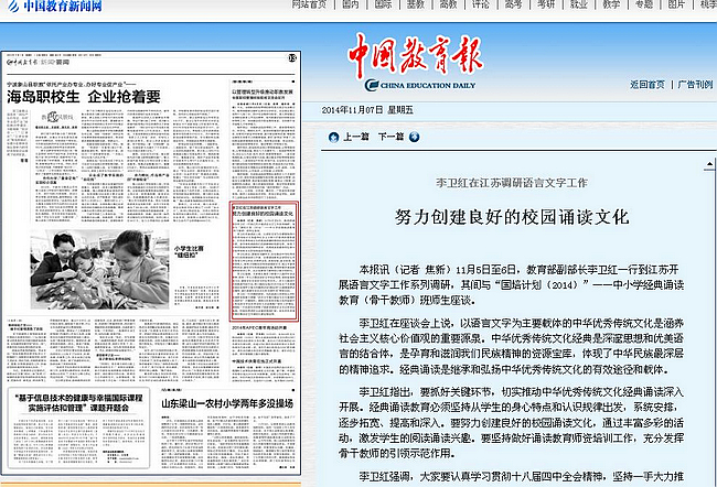 2014年11月7日,《中国教育报》报道李卫红同志在我校调研语言文字工作。http://paper.jyb.cn/zgjyb/html/2014-11/07/content_425876.htm?div=-1努力创建良好的校园诵读文化11月5日至6日,教育部副部长李卫红一行到江苏开展语言文字工作系列调研,其间与“国培计划(2014)”——中小学经典诵读教育(骨干教师)班师生座谈。李卫红在座谈会上说,以语言文字为主要载体的中华优秀传统文化是涵养社会主义核心价值观的重要源泉。中华优秀传统文化经典是深