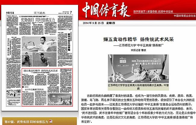 【中国体育报】撷五禽动作精华 扬传统武术风采——江苏师范大学“中华五禽操”值得推广