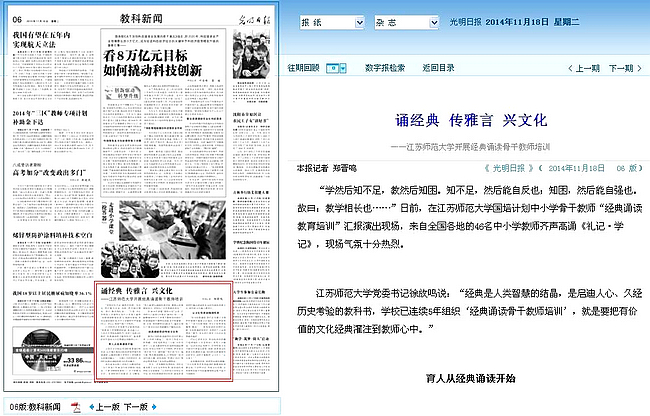 2014年11月18日,光明日报第六版以“诵经典传雅言兴文化”为题,专题报道了我校开展经典诵读骨干教师培训活动。新闻链接地址:http://epaper.gmw.cn/gmrb/html/2014-11/18/nw.D110000gmrb_20141118_12-06.htm?div=-1“学然后知不足,教然后知困。知不足,然后能自反也;知困,然后能自强也。故曰:教学相长也……”日前,在江苏师范大学国培计划中小学骨干教师“经典诵读教育培训”汇报演出现场,来自全国各地的46名中小学教师齐声高诵《礼