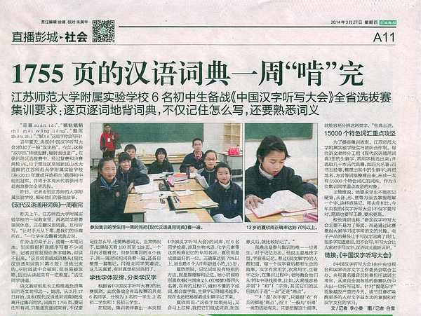 【彭城晚报】江苏师范大学附属实验学校6名初中生备战《中国汉字听写大会》全省选拔赛