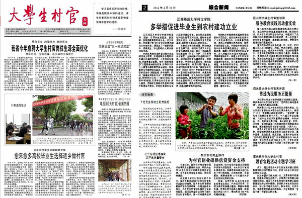 2014年4月30日,江苏省《大学生村干部》报在第二版以“江苏师范大学科文学院多举措促进毕业生到农村建功立业”为题,报道我院在毕业生“村干部”选聘工作中的主要做法。全文如下:江苏师范大学科文学院多举措促进毕业生到农村建功立业江苏师范大学科文学院积极宣传、鼓励、引导学生到基层、到西部、到祖国最需要的地方去。近几年来,学院累计有307名毕业生被选聘为大学生村干部,涌现出了一批爱岗敬业、成绩突出、社会影响力大的优秀村干部代表。学院在思想政治教育过程中突出理想信念教育,在潜移默化中帮助学生确立正确的世界