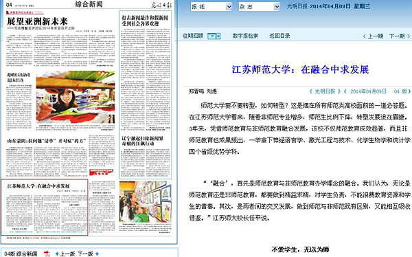 2014年4月9日,光明日报第四版以“江苏师范大学:在融合中求发展”为题,专题报道了我校优势学科建设及融合转型发展成果。链接地址:http://epaper.gmw.cn/gmrb/html/2014-04/09/nw.D110000gmrb_20140409_7-04.htm?div=-1江苏师范大学:在融合中求发展师范大学要不要转型,如何转型?这是摆在所有师范类高校面前的一道必答题。在江苏师范大学看来,随着非师范专业增多,师范生比例下降,转型发展迫在眉睫。3年来,凭借师范教育与非师范教育融合