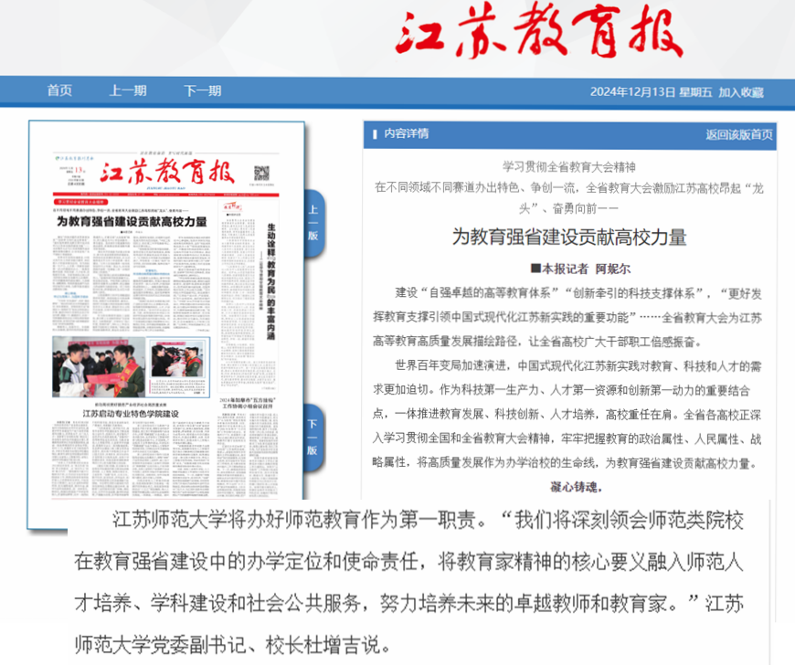 江苏教育报12月13日头版以“学习贯彻全省教育大会精神 在不同领域不同赛道办出特色、争创一流,全省教育大会激励江苏高校昂起“龙头”、奋勇向前——为教育强省建设贡献高校力量”为题综合报道全省高校学习贯彻全省教育大会精神,文章的第三部分“彰显特色,在不同领域不同赛道争创一流”相关内容中发布了对我校杜增吉校长的采访内容。报道内容如下:学习贯彻全省教育大会精神在不同领域不同赛道办出特色、争创一流,全省教育大会激励江苏高校昂起“龙头”、奋勇向前——为教育强省建设贡献高校力量■本报记者阿妮尔 建设“自